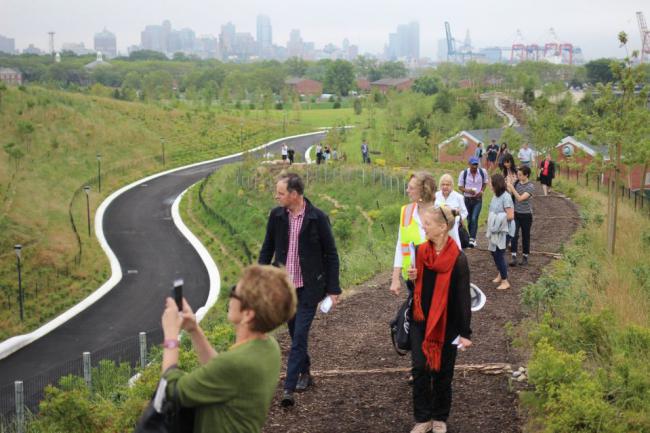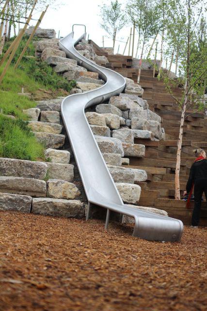 這個7000萬美元的空間是由一個公私合營機構資助,能吸引各個年齡段的人群。Slide Hill顧名思義會有4個滑梯,包括該城市最長的一個,蜿蜒穿行約17米(57英尺)。Discovery Hill特色是一個藝術裝置,出自英國藝術家雷切爾?懷特瑞德,南面的一個安靜的小山。